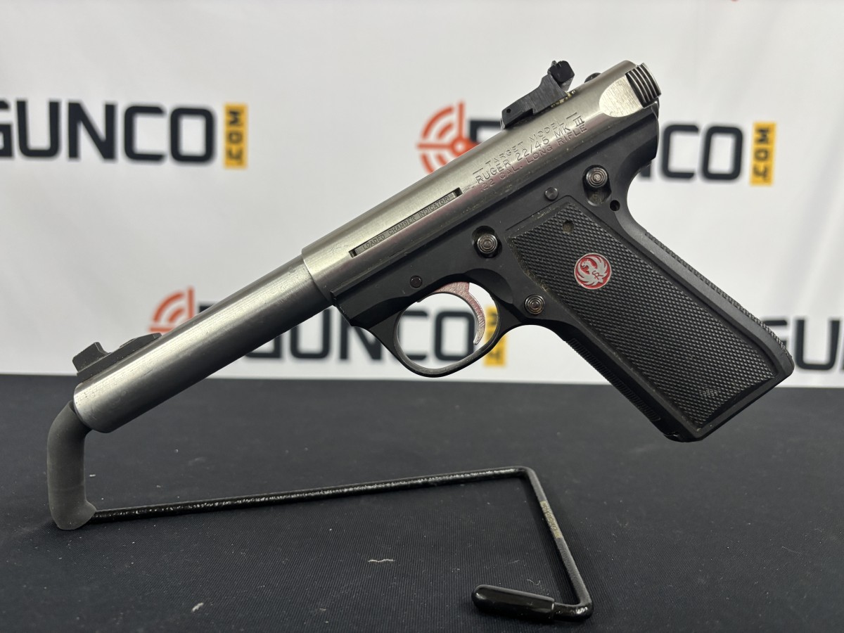 VERY GOOD CONDITION RUGER 22/45 MKIII .22 LONG RIFLE PISTOL. STAINLESS STEEL 5 1/2 INCH BULL BARREL, ADJUSTABLE SIGHTS, POLYMER FRAME. INCLUDES 1 FACTORY 10 ROUND MAGAZINE.