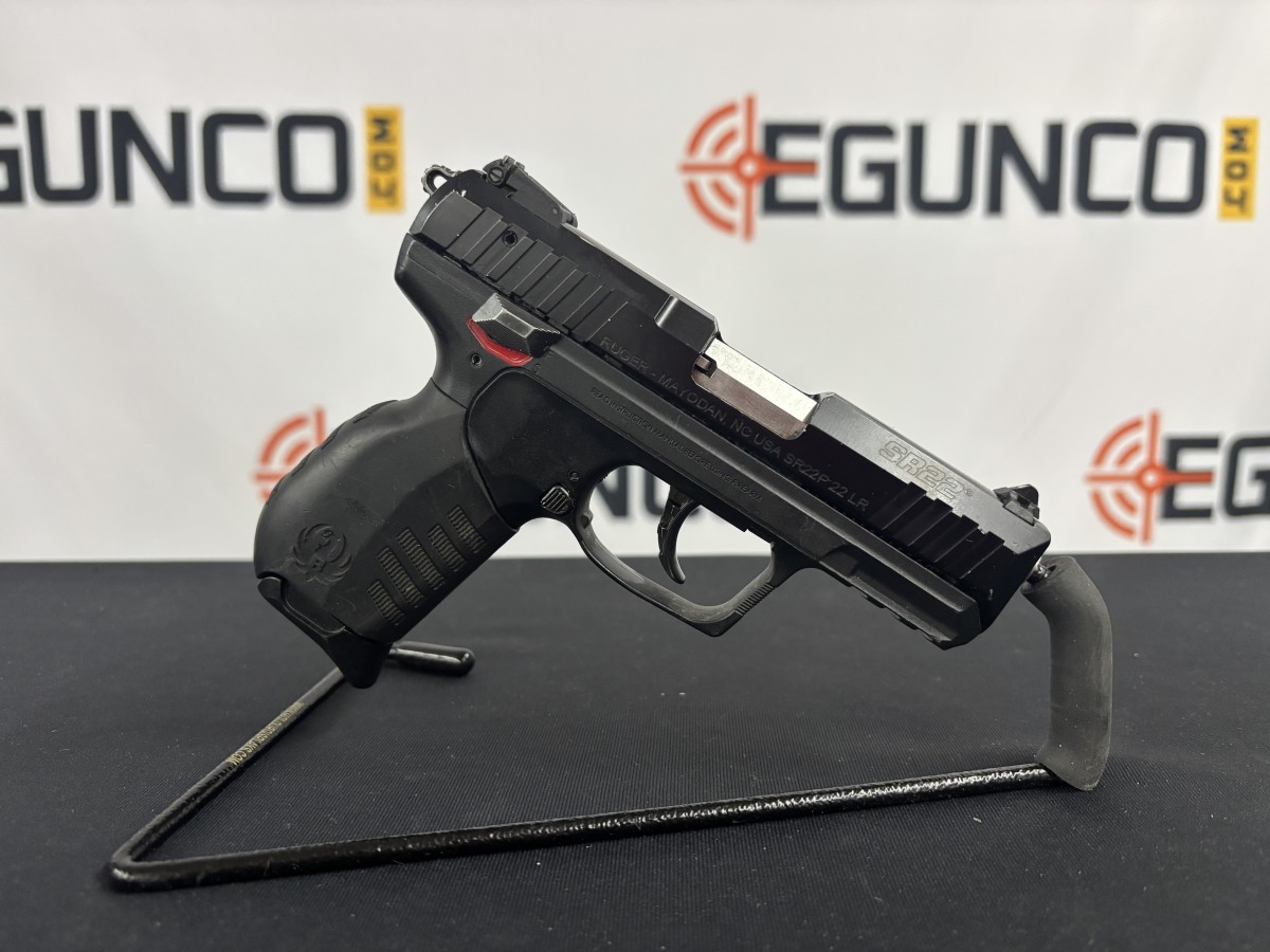 RUGER SR22 .22LR PISTOL. BLACK FINISH, BLACK POLYMER FRAME, ACESSORY RAIL, ADJUSTABLE REAR SIGHT, AMBI SAFETY. INCLUDES 1 FACTORY 10 ROUND MAGAZINE. GUN HAS A LITTLE FINISH WEAR ON THE SLIDE AND SAFETY LEVERS.