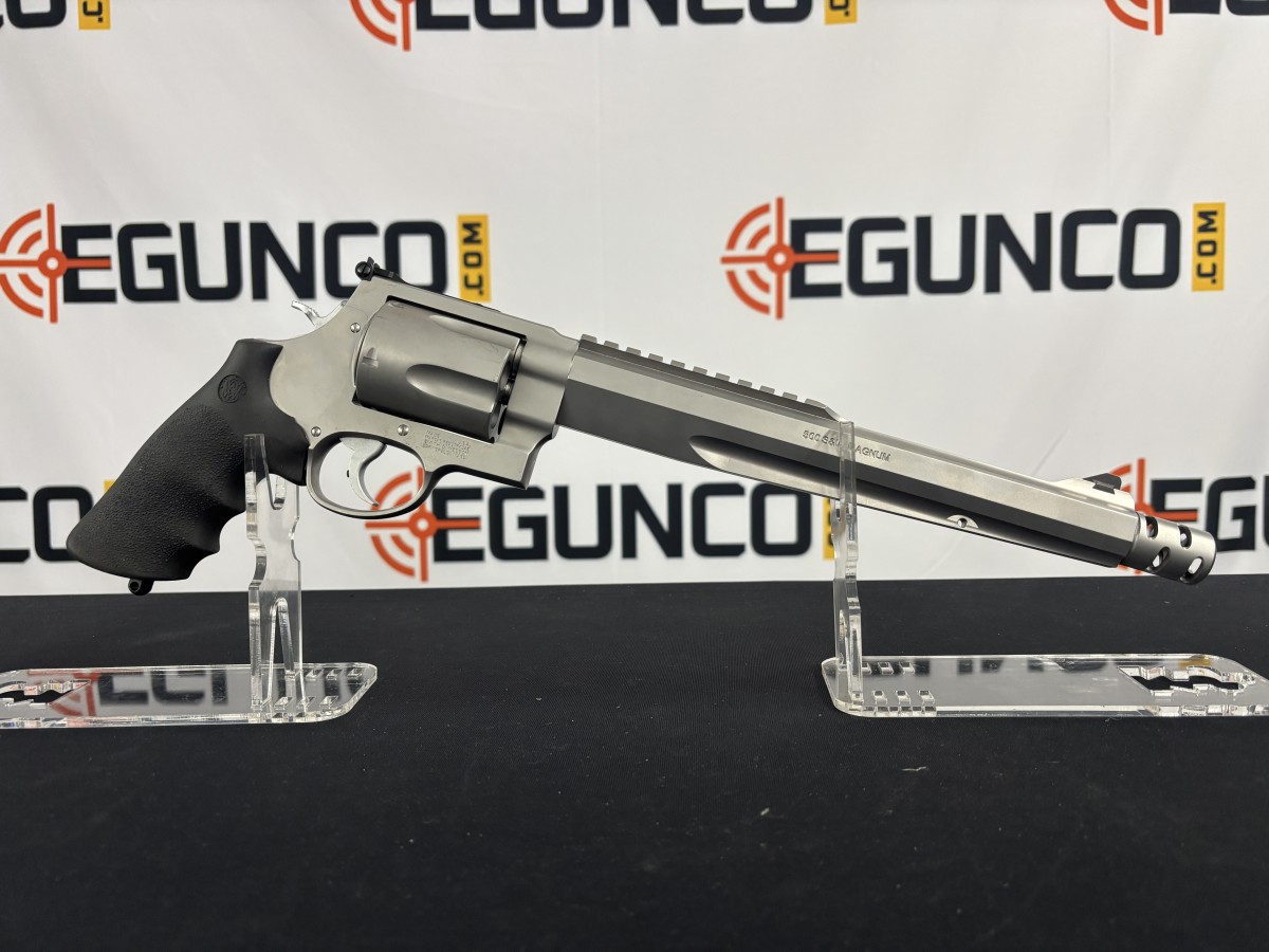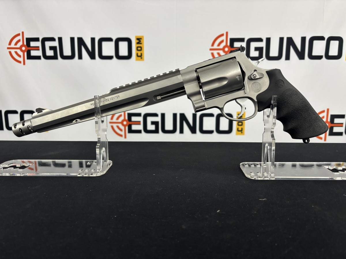 GREAT CONDITION S&W 500 MAGNUM FROM THE PERFORMANCE CENTER. 10 1/2 INCH BARREL WITH COMP, ALL STAINLESS STEEL CONSTRUCTION, ADJUSTABLE REAR SIGHT, DOVETAILED ORANGE FROM FRONT, PICATINNY SCOPE BASE, 5RD CYLINDER, DA/SA TRIGGER. NO BOX.