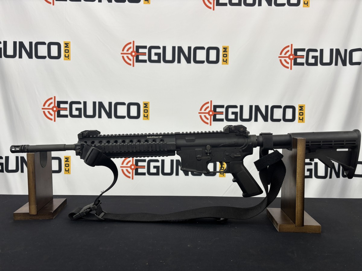 S&W M&P15 TACTICAL AR-15 5.56/223 CARBINE. IT FEATURES A 16 INCH M4 PROFILE BARREL, FREE FLOAT QUAD RAIL, FACTORY METAL FOLDING FRONT AND REAR SIGHTS, A2 FLASH HIDER, COLLAPSIBLE STOCK. GUN HAS SOME LIGHT FINISH WEAR. INCLUDES 1 30 ROUND MAGAZINE.