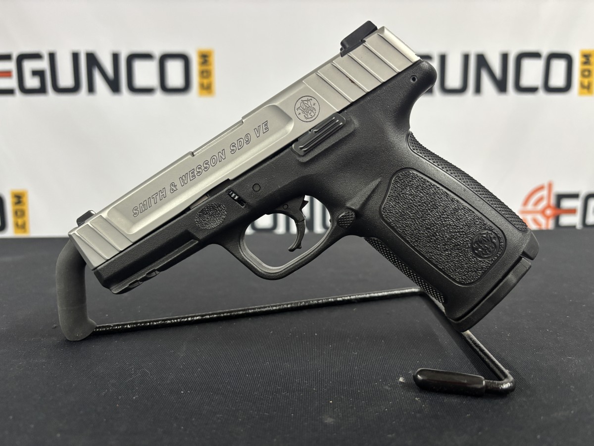 VERY GOOD CONDITION S&W SD9 VE 9MM PISTOL. STAINLESS SLIDE AND BARREL, POLYMER FRAME, 3 DOT SIGHTS, ACCESSORY RAIL. INCLUDES 1 FACTORY 16 ROUND MAGAZINE.