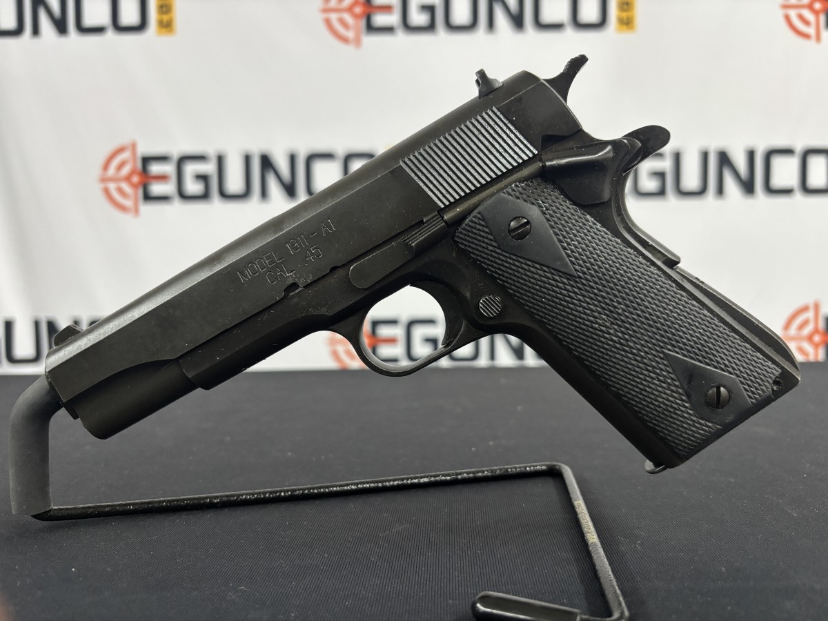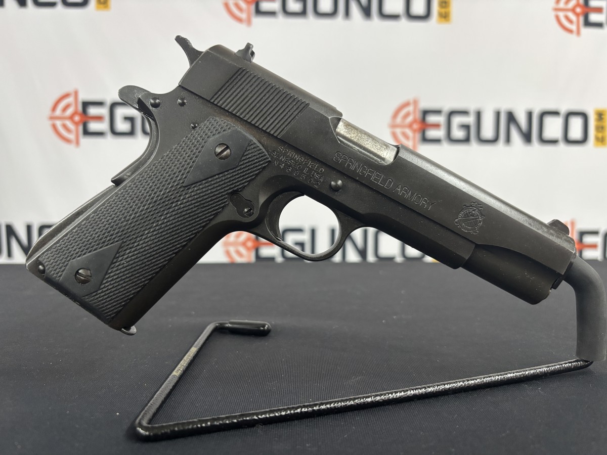 SPRINGFIELD ARMORY MILSPEC 1911 IN VERY GOOD CONDITION. THIS IS AN OLDER GUN WITH THE ORIGINAL LOGO AND MARKINGS ON THE SLIDE BEFORE SPRINGFIELD CHANGED TO THE SMALL BLOCK LETTERING. IT FEATURES A PARKERIZED FINISH, ALL STEEL CONSTRUCTION, 3 DOT SIGHTS, ORIGINAL SPUR HAMMER, SHORT TRIGGER AND ARCHED MAINSPRING HOUSING. IT WEARS RUBBER GRIPS AND INCLUDES 1 7 ROUND MAGAZINE, NO BOX.
