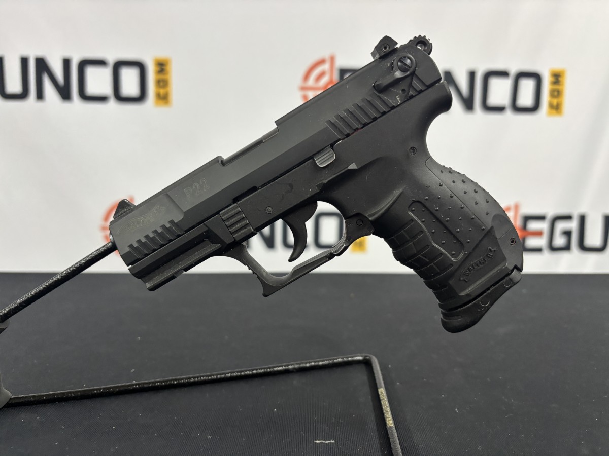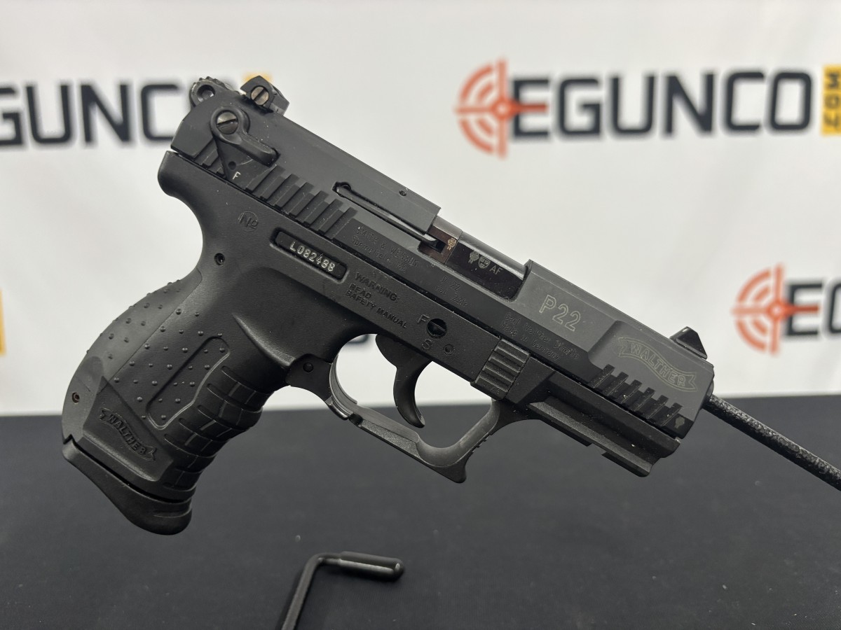 GREAT CONDITION WALTHER P22 .22 LONG RIFLE SEMI AUTO PISTOL. AMBI MANUAL SAFETY, ALL BLACK FISNIH, 3 DOT SIGHTS, ACCESSORY RAIL, FRONT AND REAR COCKING SERRATIONS. INCLUDES 1 FACTORY 10 ROUND MAGAZINE.
